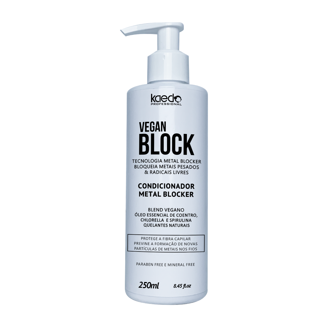 O Condicionador VEGAN BLOCK tem em sua composição a Tecnologia Metal Blocker um blend 100% vegano, total free com óleo essencial de coentro, chlorella e spirulina + algas marinhas do mediterrâneo que são quelantes naturais com ação na reparação dos danos causados pelos metais pesados inclusive os que tiveram contato com água de piscina, água dura e agentes poluidores, interagindo com os fios coloridos, descoloridos e mechados, prevenindo o acúmulo de toxinas e metais nas fibras capilares, proporcionando hidratação, brilho e maciez. Para melhor resultado recomenda-se o uso completo da linha.