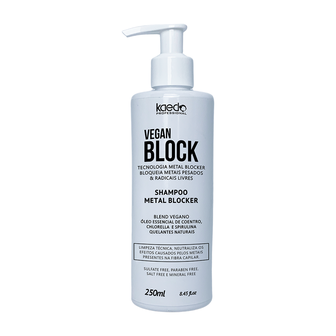 O Shampoo VEGAN BLOCK remove e neutraliza o acúmulo de metais pesados na fibra capilar, a Tecnologia Metal Blocker presente na linha possui em sua composição um blend 100% vegano, total free com óleo essencial de coentro, chlorella e spirulina + algas marinhas do mediterrâneo que são quelantes naturais removendo os metais dos fios inclusive os que tiveram contato com água de piscina, água dura e agente poluidores proporcionando uma melhora no aspecto da fibra capilar, no caso de cabelos esverdeados devido ao contato com o cloro junto com o Fluido Bloqueador ajuda a remover até 80% do esverdeado dos fios na primeira aplicação. Interage com os fios coloridos, descoloridos e mechados removendo o acumulo de partículas de metais dando um aspecto saudável ao cabelo. Para melhor resultado recomenda-se o uso completo da linha.